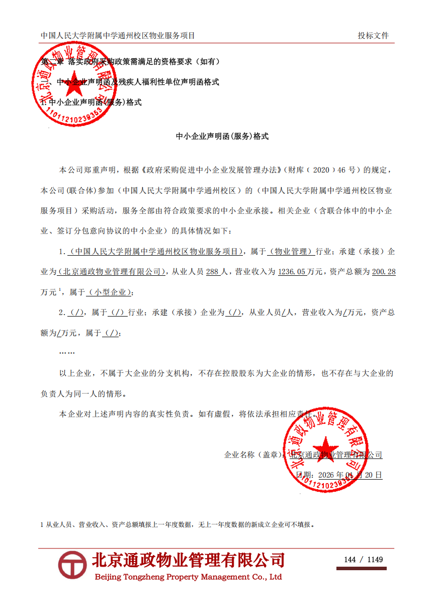 二、项目名称:中国人民大学附属中学通州校区2026年物业服务政府采购项目