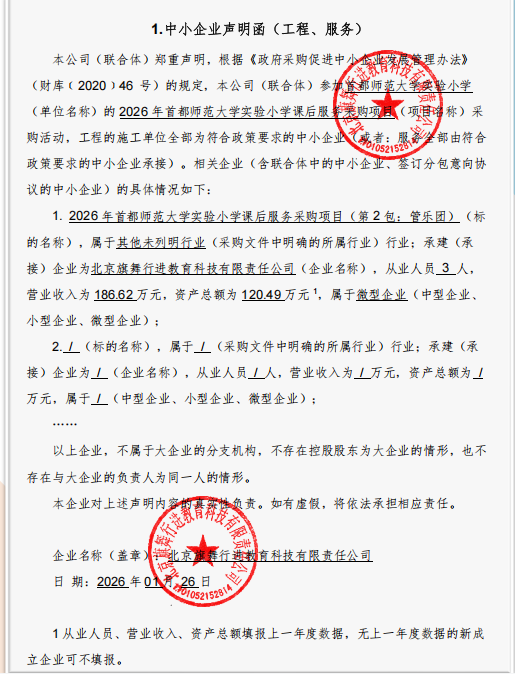 | 北京旗舞行进教育科技有限责任公司 | 1 | 68.8万元 | 68.8万元 | 内容包括但不限于管乐社团的日常训练、演出指导等服务 | ||