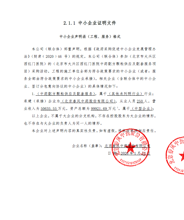 | 北京春风中药股份有限公司 | 17.48% | 为满足北京市大兴区西红门医院中药配方颗粒调剂工作,本项目采购中药配方颗粒供应及配套服务。项目预算金额:260万元。合同履行期限:一年。 |