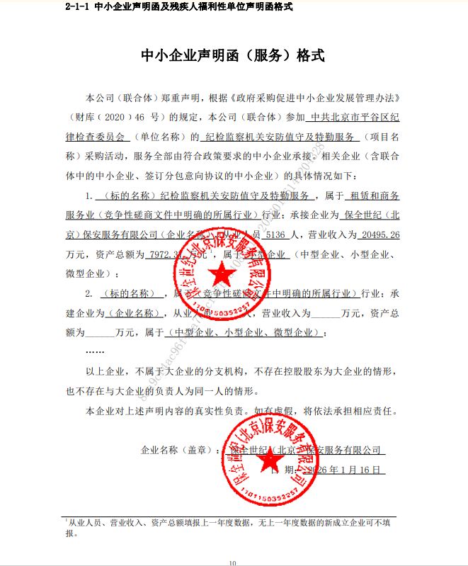 | 保全世纪(北京)保安服务有限公司 | 1 | 175.5万元 | 175.5万元 | 为中共北京市平谷区纪律检查委员会提供纪检监察机关安防值守及特勤服务。 |