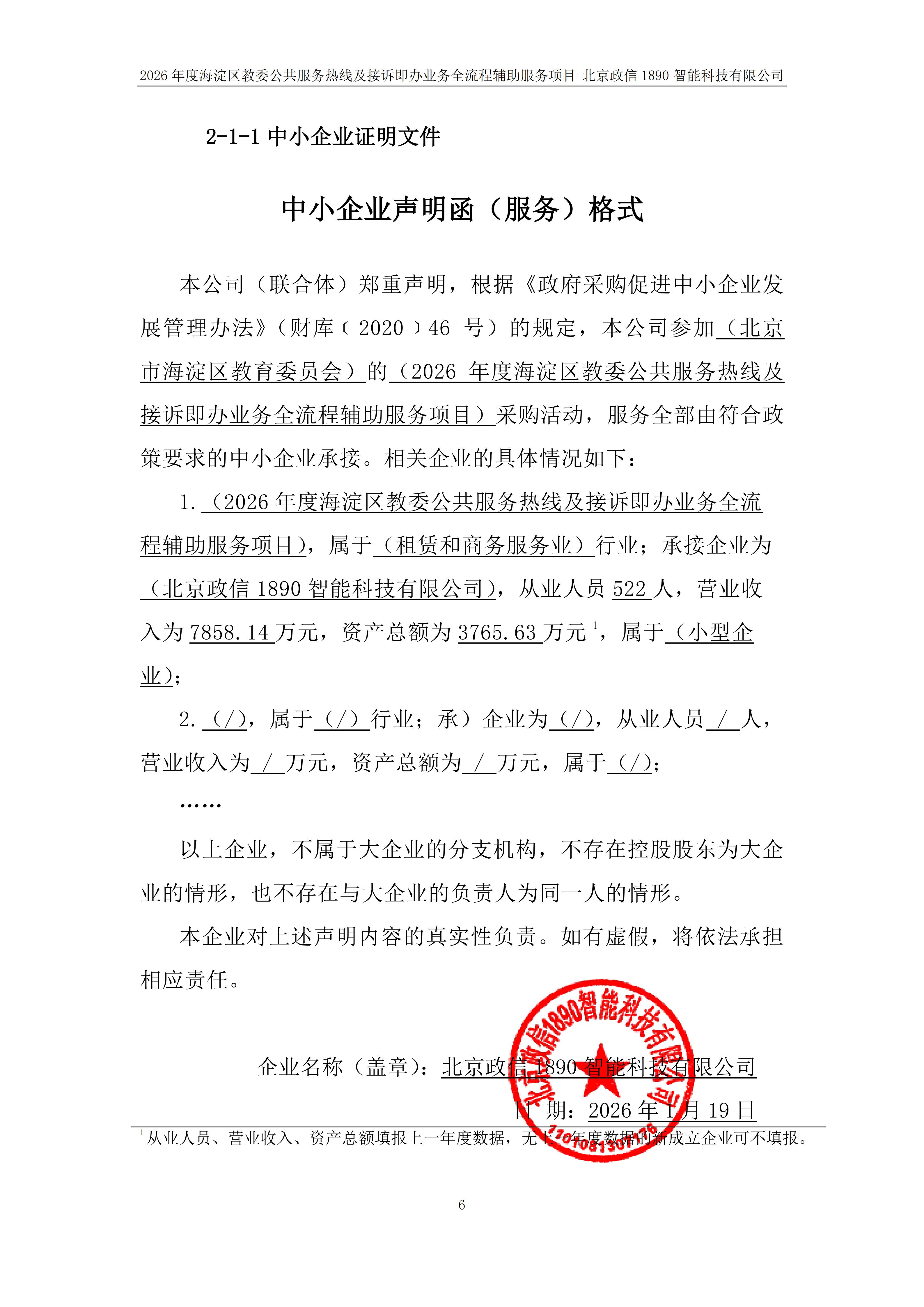 | 北京政信1890智能科技有限公司 | 1 | 485.592万元 | 485.592万元 | 2026年度海淀区教委公共服务热线及接诉即办业务全流程辅助服务项目要求供应商需按采购人的服务要求自备呼叫中心系统平台、综合热线服务、接诉即办辅助服务,向采购人提供业务咨询服务、系统平台服务、人员服务等,采购人只购买服务,采购人无上述设备及设施的所有权和处置权。 |