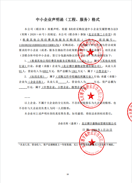 项目用途、简要技术要求:为北京市第二十中学小营校区及新都校区两个校区提供校园司机、校医、宿舍管理、实验、文印等服务保障人员