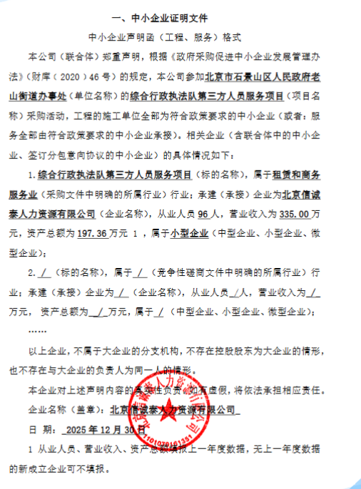 | 北京信诚泰人力资源有限公司 | 1 | 49.9万元 | 49.9万元 | 为进一步提高执法效率和质量,有效填补内务行政类和派出服务类工作的人员空白,集中于制作文书与送达、视频采集、整理归档等行政性内部工作上,做好环境保障服务和执法辅助服务,提高执法效率和质量。现采购综合行政执法队第三方人员服务,协助开展执法队行政性内部工作。合同期限为1年。 |