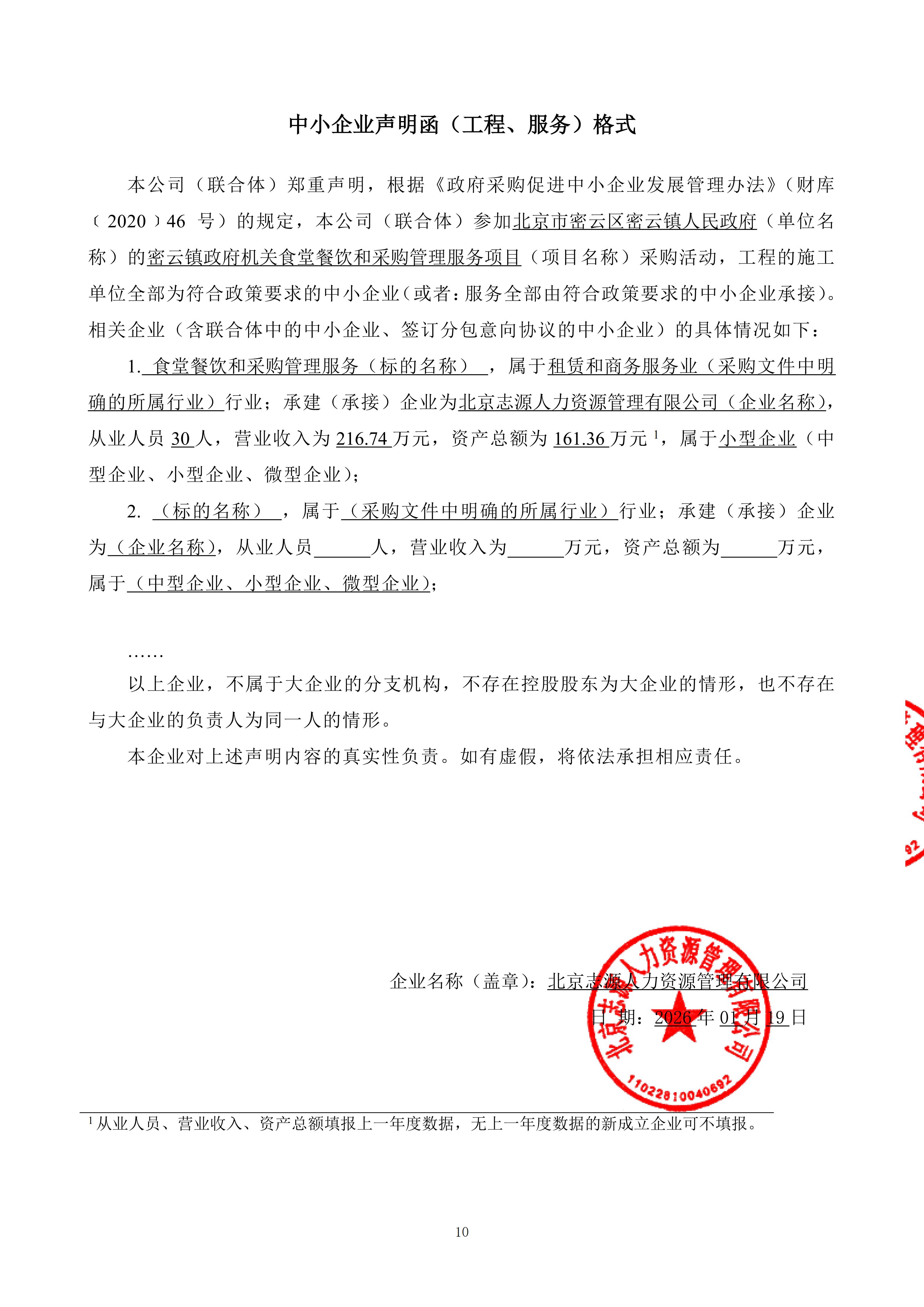 | 北京志源人力资源管理有限公司 | 1 | 173.2812万元 | 173.2812万元 | 为密云镇政府机关工作人员以及来客需要就餐者提供餐饮服务,包括:早餐、午餐、晚餐以及来客就餐等 |