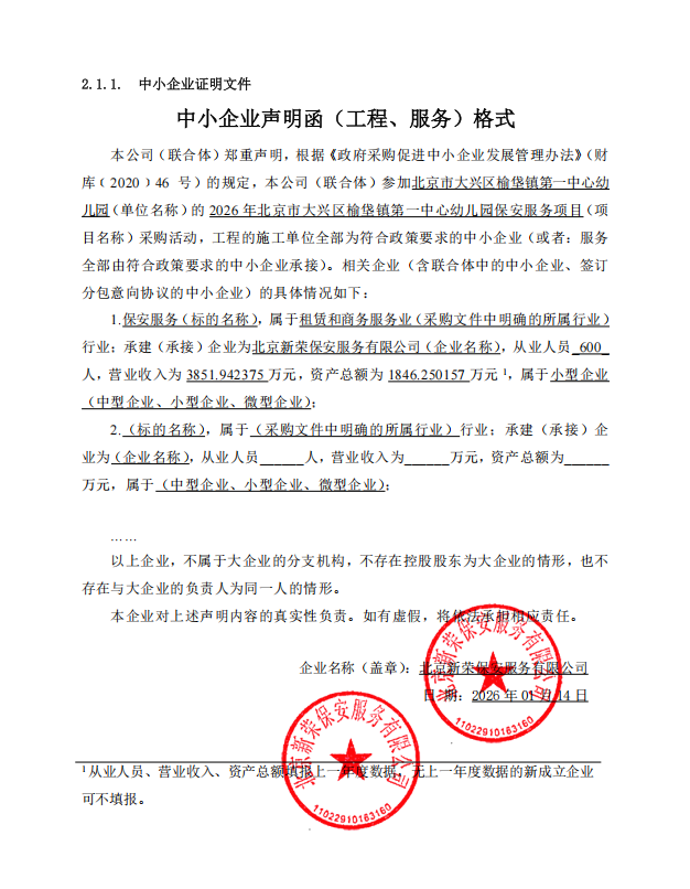 | 北京新荣保安服务有限公司 | 1 | 113.76万元 | 113.76万元 | 为维护园所安全稳定,保障正常运行,聘请保安人员24名,对园内进行巡逻检查并完成园内安排的临时性安全保卫工作,采购2026年北京市大兴区榆垡镇第一中心幼儿园保安服务项目。预算金额:115.2万元。合同履行期限:1年。 |