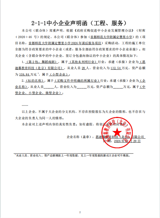 | 思迪幕教育科技(北京)有限公司 | 1 | 19.68万元 | 19.68万元 | 首都师范大学附属定慧里小学2026年课后服务项目(第2包:舞蹈戏剧) | ||