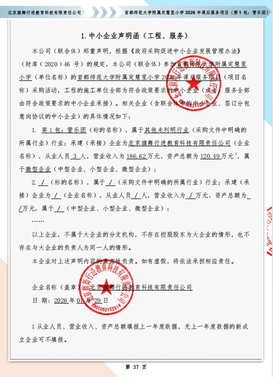 | 北京旗舞行进教育科技有限责任公司 | 1 | 77.2万元 | 77.2万元 | 首都师范大学附属定慧里小学2026年课后服务项目(第1包:管乐团) |