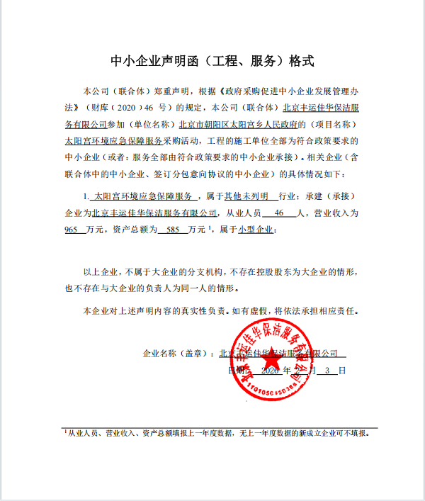 | 北京丰运佳华保洁服务有限公司 | 北京市朝阳区金盏乡黎各庄村299号 | 91110105067269098A | 166.08 万元 | 评审总得分(综合评分法): 92.67 分 |