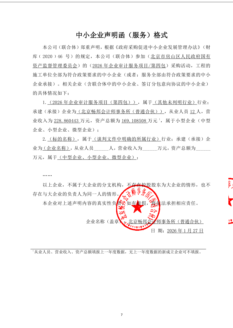 供应商名称:北京畅邦会计师事务所(普通合伙)(小型企业)