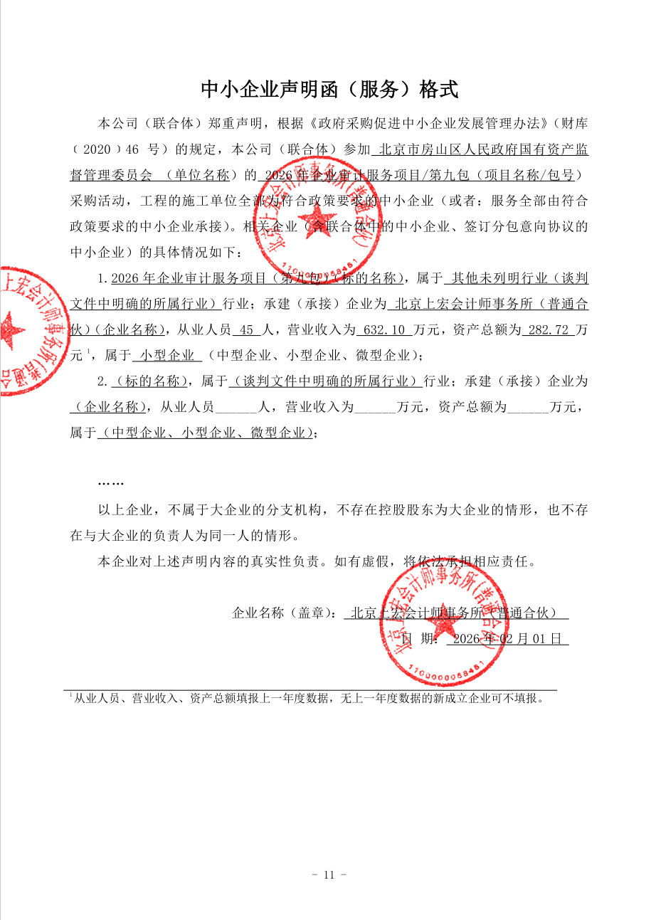 名称:2026年企业审计服务项目(第九包) 服务范围:自合同签订之日起30天日历日内向采购人出具审计报告,并按照区国资委要求在合同履约期内对上述被审计单位对企业财务决算报表中的主附表、财务情况表、会计附注及专项情况表等指标数据进行审计,并出具审计报告等详见谈判文件。 服务要求:详见谈判文件。 服务时间:自合同签订之日起30天日历日内 |