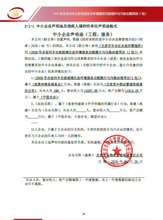 二、项目名称:2026年永定河丰台段流域生态环境服务功能提升与污染治理项目其他服务采购项目