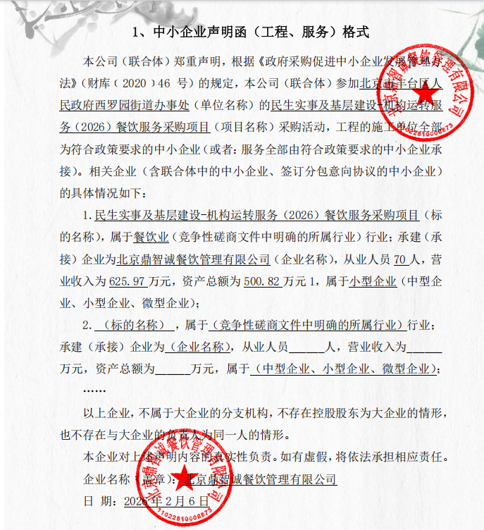 二、项目名称:民生实事及基层建设-机构运转服务(2026)餐饮服务采购项目