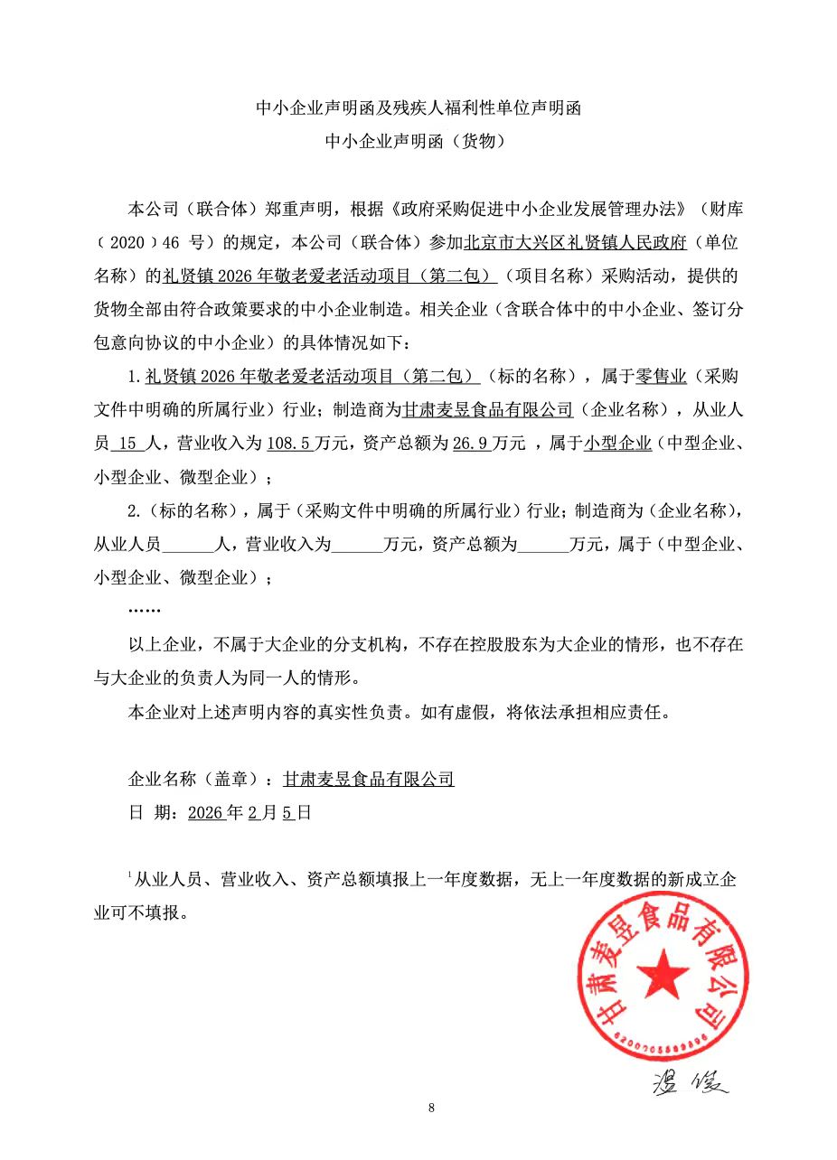 礼贤镇2026年敬老爱老活动项目 (第二包),中标单位:甘肃麦昱食品有限公司,中标金额:540000.00元