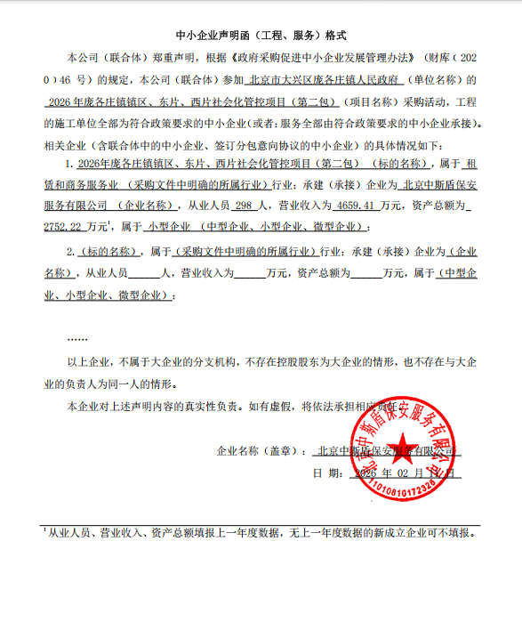 | 北京中斯盾保安服务有限公司 | 1 | 341.6448万元 | 341.6448万元 | 围绕城市管理、治安秩序、拆违控违、安全防火、大气污染防治、出租房屋管理等方面开展村庄巡查管控工作,需要管控服务人员62人。 |