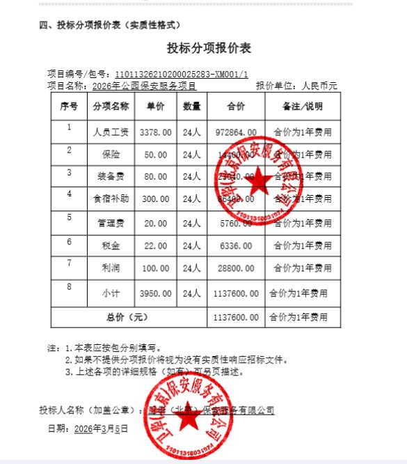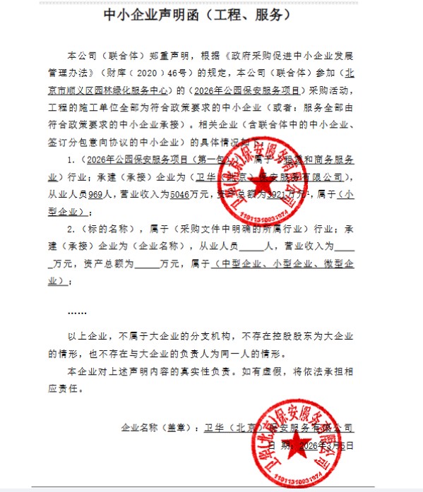 名称:2026年公园保安服务项目(第一包) 服务内容:顺义公园、仁和公园、卧龙公园(含减河凤凰园、卧龙西园)、光明文化广场、怡园所辖区域内等。具体详见招标文件采购需求。 合同履行期:一年(最终以合同签订日期为准) 服务标准:详见招标文件 |