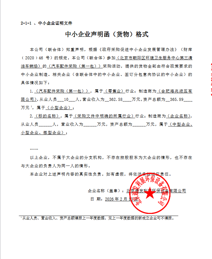 | 北京通发利展环保设备有限公司 | 汽车配件采购(第一包) | / | 1 | 60万元 | 60万元 | 合同履行期限:自采购合同签订之日起至2026年6月30日 |
