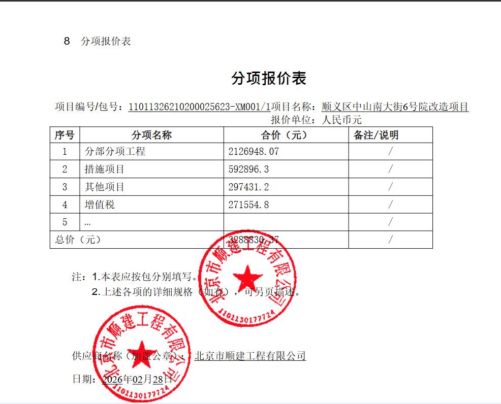| 北京市顺建工程有限公司 | 1 | 328.883037万元 | 328.883037万元 | 详见磋商文件 |