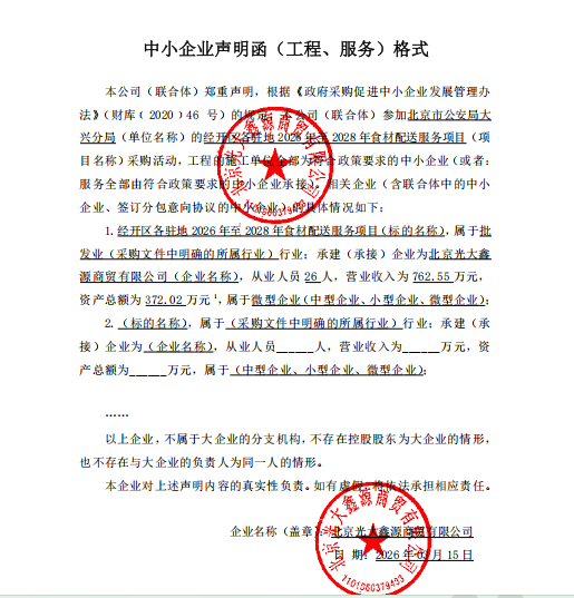 为经开区警务中心、内部单位保卫支队、禁毒办、南海子公园派出所提供三年的食材配送服务,包括粮食、肉类、蔬菜、副食、调料、其它等,依据采购人需求提供配送。 |