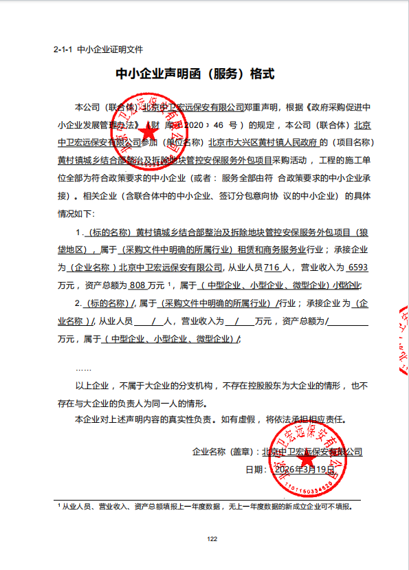 | 北京中卫宏远保安有限公司 | 1 | 958.692万元 | 958.692万元 | 负责黄村镇狼垡地区全天不间断巡逻与看护值守工作 | ||