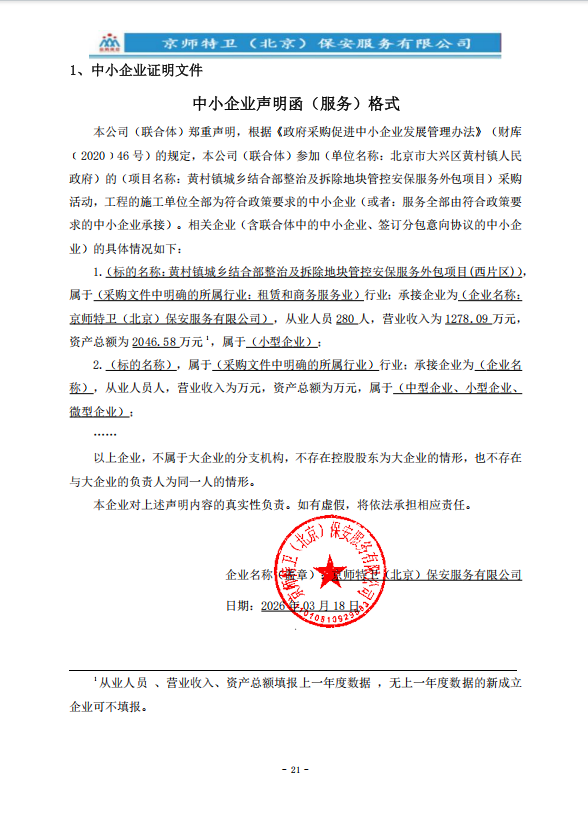 | 京师特卫(北京)保安服务有限公司 | 1 | 321.156万元 | 321.156万元 | 负责黄村镇西片区全天不间断巡逻与看护值守工作 |