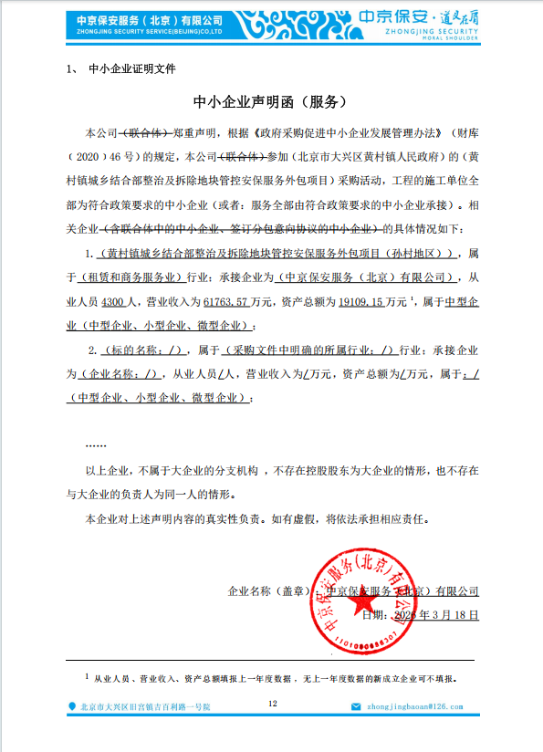 | 中京保安服务(北京)有限公司 | 1 | 575.5968万元 | 575.5968万元 | 负责黄村镇孙村地区全天不间断巡逻与看护值守工作 | ||