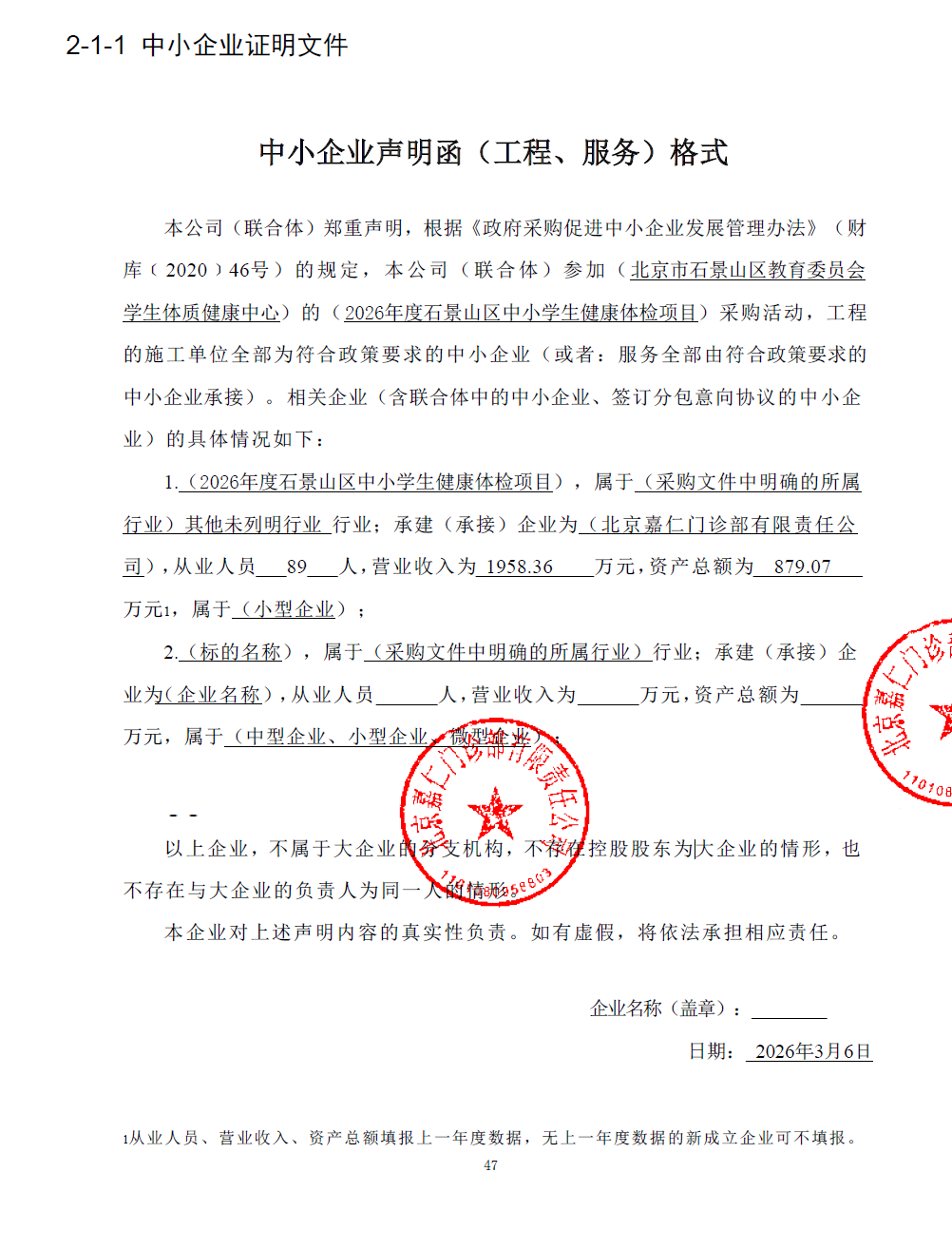 | 北京嘉仁门诊部有限责任公司 | 1 | 108.3385万元 | 108.3385万元 | 、学生体检工作服务标准及要求按照《北京市中小学生健康体检管理办法(2022年版)》(以下 简称《办法》)和《北京市中小学学生健康体检质量管理与控制指标(2023年版)》(以下简称《质控 指标》)中的各项规定执行,依据此条提供承诺。春季学期为2026年3月20日至2026年6月30日。秋季学期为2026年9月1日至2026 年12月30日。 |