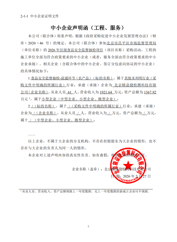 | 北京精益捷检测科技有限公司 | 1 | 109.3968万元 | 109.3968万元 | 食品安全抽检监测承检机构将依据国家市场监督管理总局、北京市市场监督管理局、昌平区市场监管局关于食品安全抽检监测工作的有关规定,拟承担食品安全抽检监测工作任务,包括区级日常监督抽检、食用农产品监督抽检等。(详见招标文件第五章 采购需求) | ||