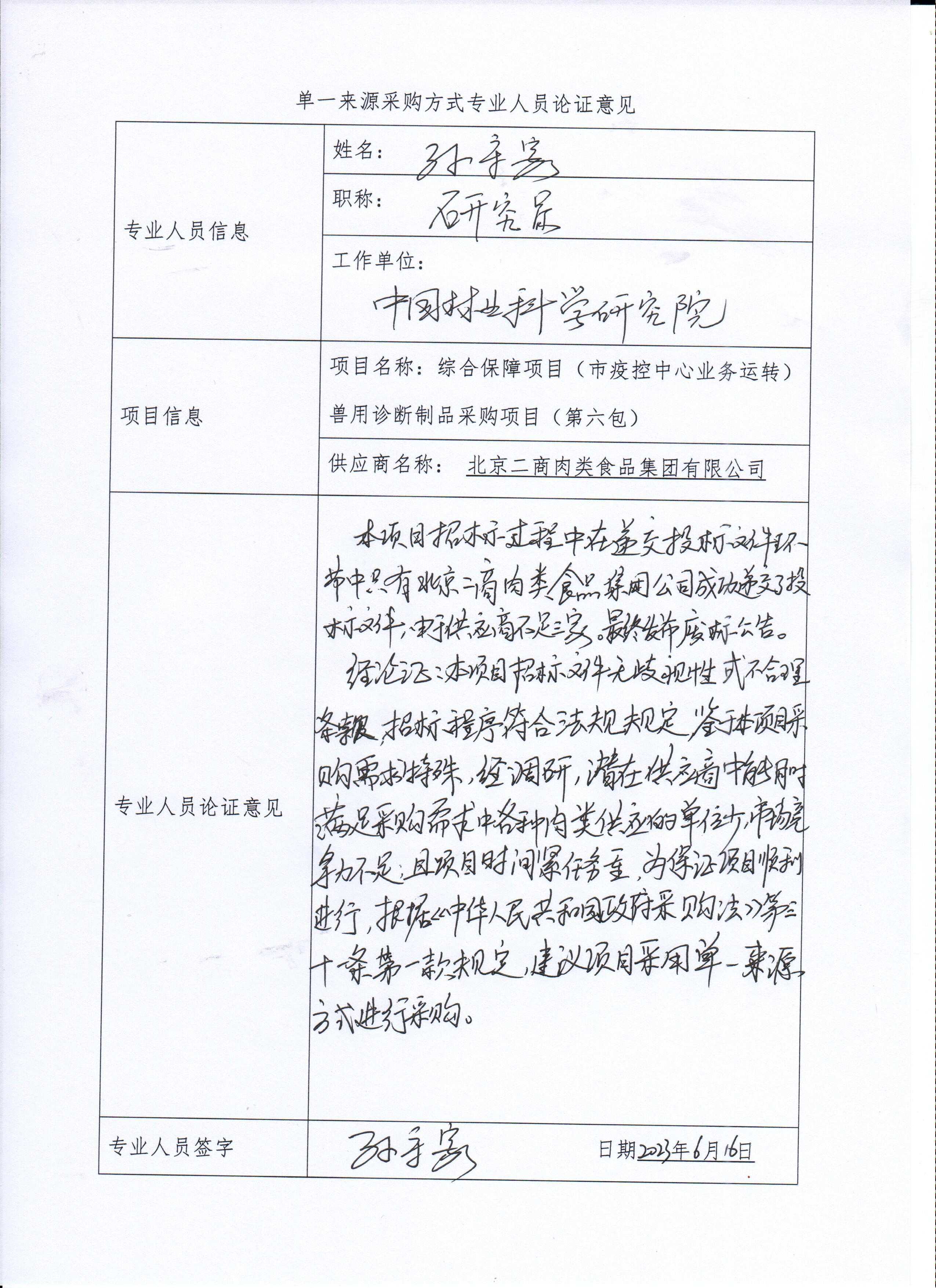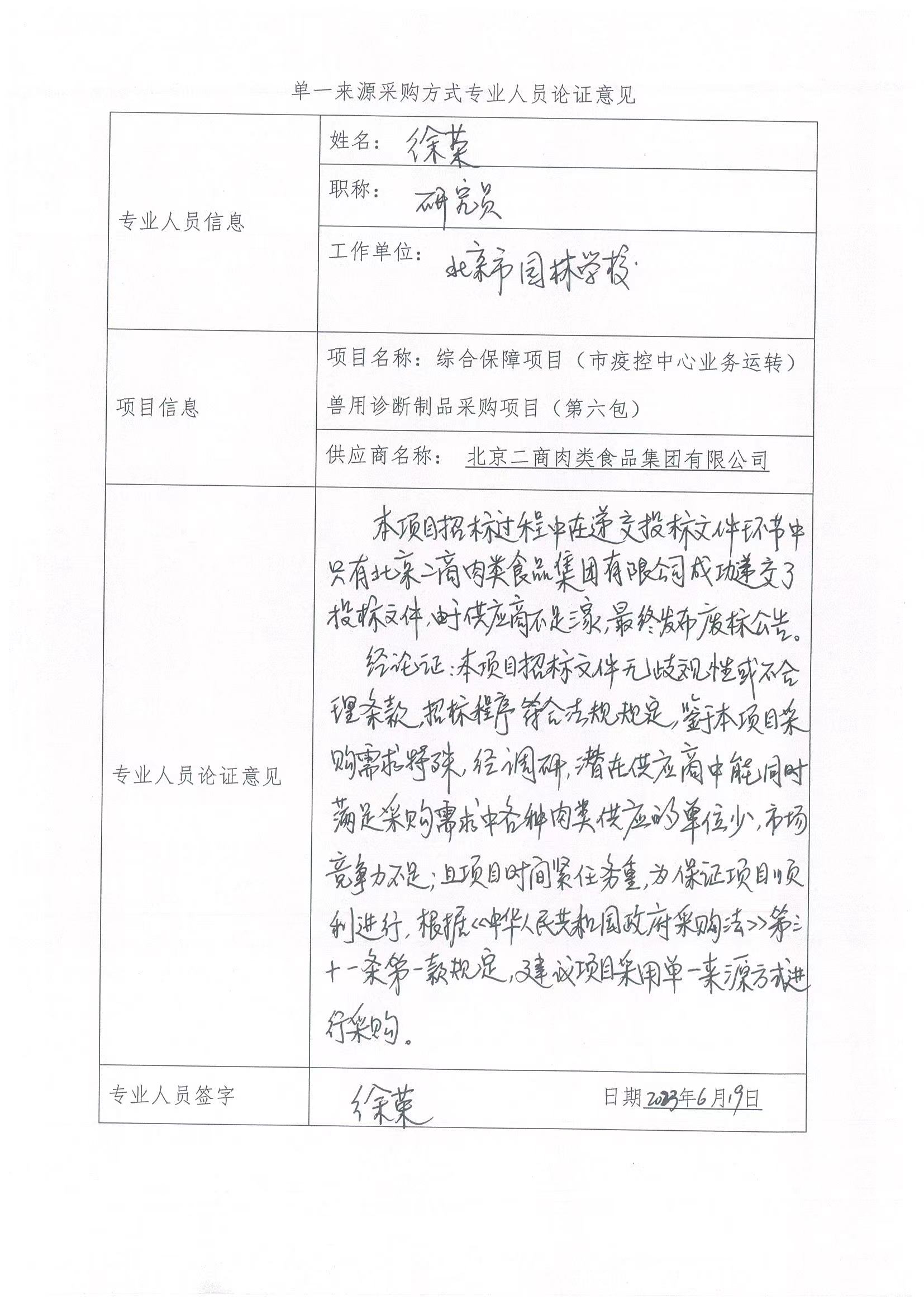 采用单一来源采购方式的原因及说明:投标截止时间为2023年6月14日09点30分,至投标截止时间为止,成功递交投标文件的单位为北京二商肉类食品集团有限公司。根据招标公告、招标文件下载情况以及投标文件递交文件签到表等材料显示,在规定时间内成功递交投标文件的投标人不足三家,本项目予以废标,招标工作符合程序。经专家论证,本项目招标文件无歧视性条款或不合理条款,招标公告时间及程序符合规定。根据中华人民共和国政府采购相关法律法规,本项目符合单一来源采购条件,申请以单一来源方式进行采购。