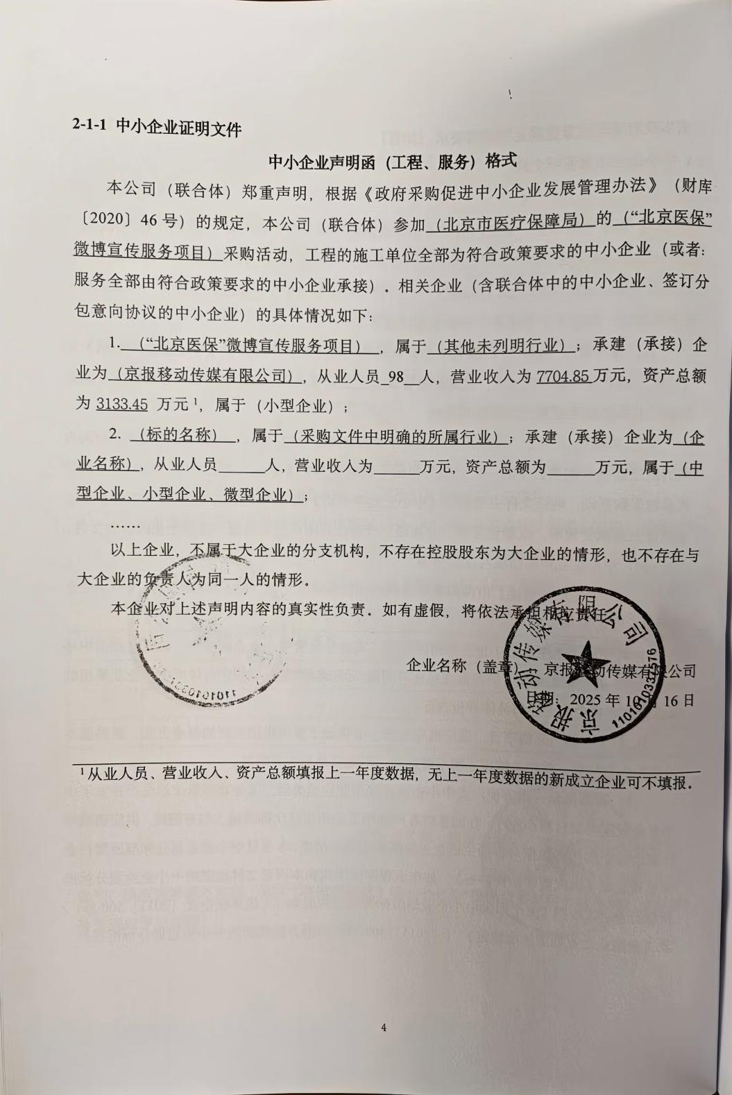 | 京报移动传媒有限公司 | 1 | 52万元 | 52万元 | “北京医保”微博宣传服务(详见竞争性磋商文件) |