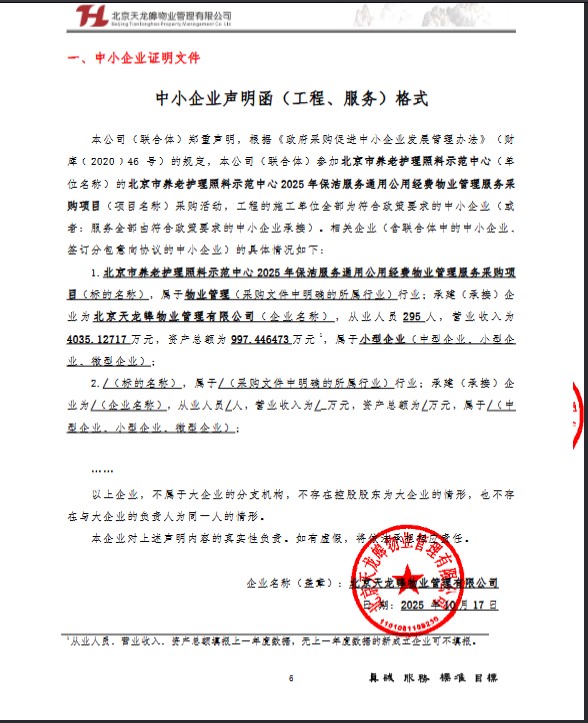 二、项目名称:北京市养老护理照料示范中心2025年保洁服务通用公用经费物业管理服务采购项目