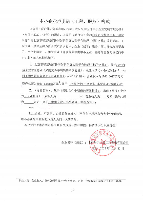 | 北京华宇恒通工程咨询有限公司 | 1 | 67.45万元 | 67.45万元 | 主要工作内容为对项目所进行的全过程监理,主要包括四项控制、三项管理和一项协调。即:质量控制、进度控制、成本控制、变更控制,信息安全管理、合同管理、信息/文档管理和组织协调等。自北京市智慧城市协同创新仿真实验平台项目开工之日起至该项目最终验收且最终决算完成之日止。具体详见招标文件。 |