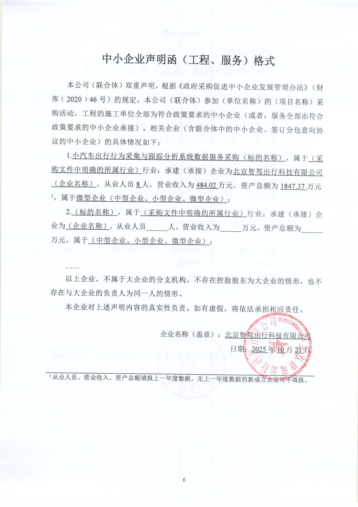 | 北京智驾出行科技有限公司 | 1 | 91.3万元 | 91.3万元 | 利用供应商已有小汽车数据资源,按照采购方需求进行数据分析,获取北京市小汽车出行行为特征数据。数据覆盖2025年所有日期,传输年度历史数据并保障实时数据的可靠传输。 |