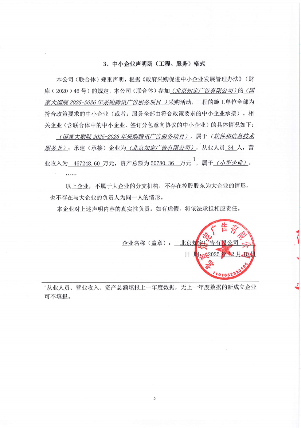 | 北京知定广告有限公司 | 1 | 159.45万元 | 159.45万元 | 国家大剧院2025-2026年采购腾讯广告服务项目 |