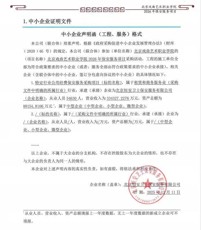 二、项目名称:北京戏曲艺术职业学院2026年保安服务项目