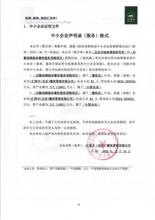 | 汇泽丰(北京)餐饮管理有限公司 | 1 | 97.8036万元 | 97.8036万元 | 为北京市地热调查研究所职工食堂提供优质的餐饮服务。(详见采购需求) |
