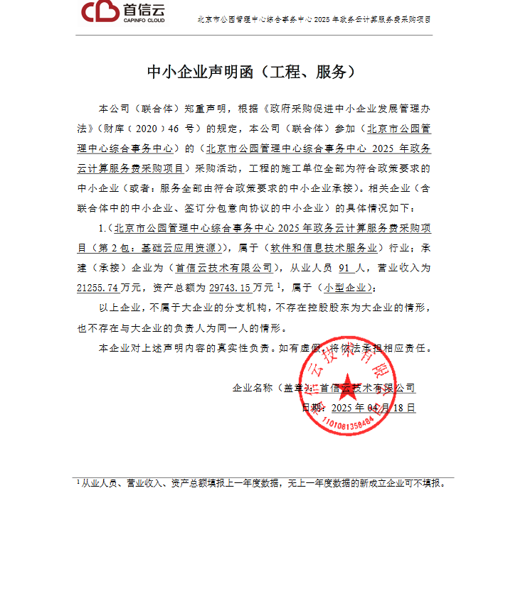 二、项目名称:北京市公园管理中心综合事务中心2025年政务云计算服务费采购项目