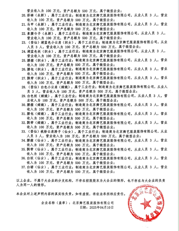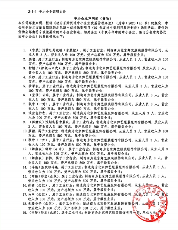 | 北京舞艺服装服饰有限公司 | (宫装)浅黄牡丹花帔(古装帔)等 | 定制 | 1 | 9.999万元 | 9.999万元 | 满足招标文件要求 |