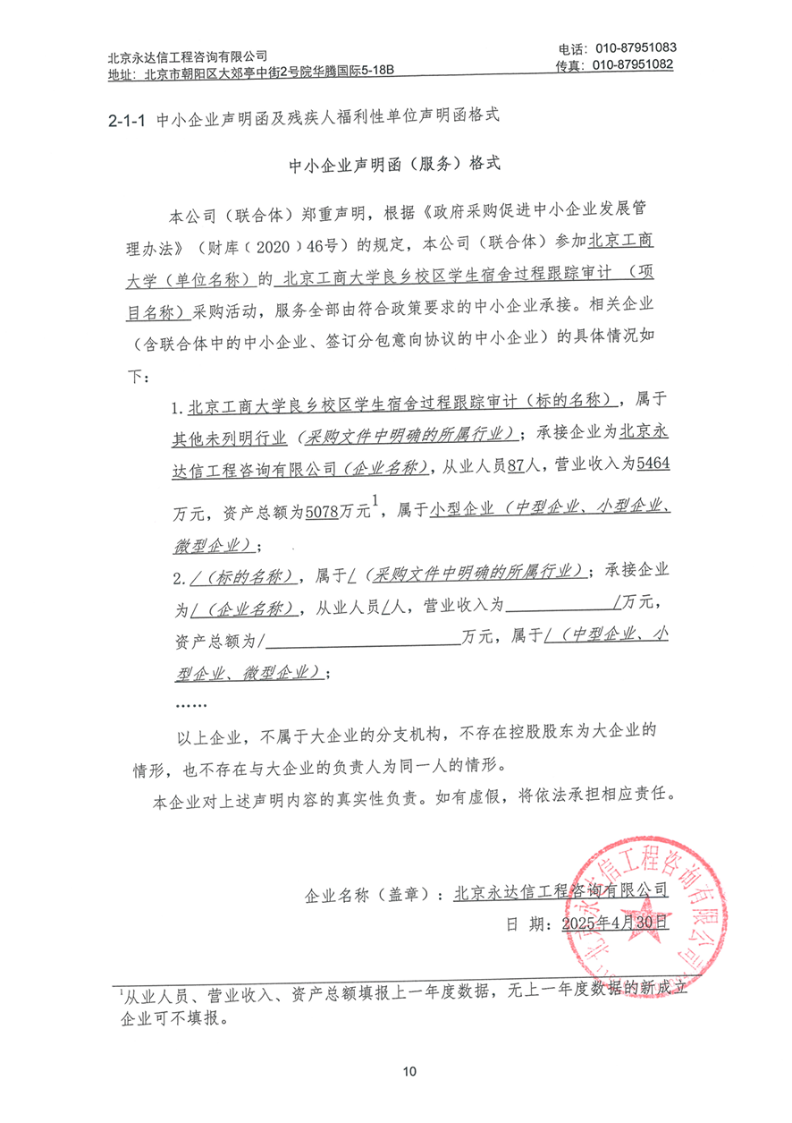| 北京永达信工程咨询有限公司 | 1 | 0万元 | 0万元 | 本项目建设地点位于北京工商大学良乡校区院内,供应商应满足北京工商大学审计处的要求按期保质完成工作任务。供应商的工作是依据本项目施工图纸,提供负责招标阶段、实施阶段、竣工阶段的各项审核服务。 |
