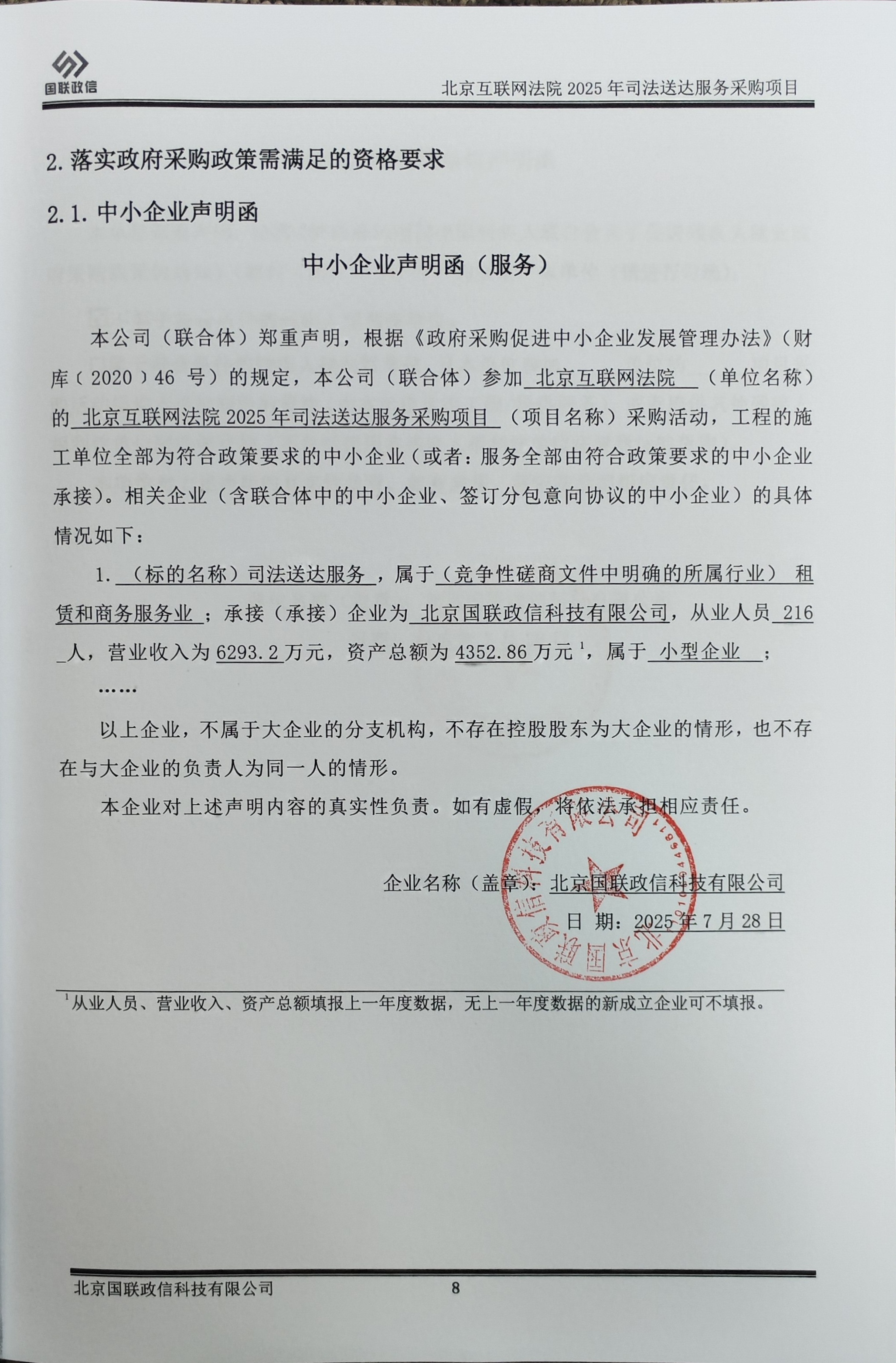 二、项目名称:北京互联网法院2025年司法送达服务采购项目