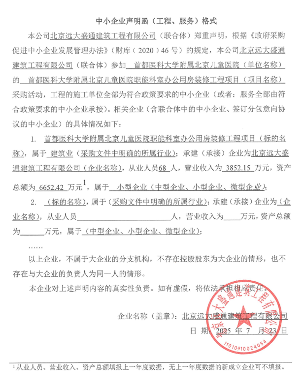 | 北京远大盛通建筑工程有限公司 | 1 | 284.261085万元 | 284.261085万元 | 首都医科大学附属北京儿童医院职能科室办公用房装修工程项目,具体内容详见磋商文件 |