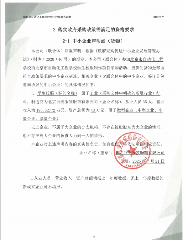 | 北京邑美服装服饰有限公司 | 290 | 满足磋商文件要求 |