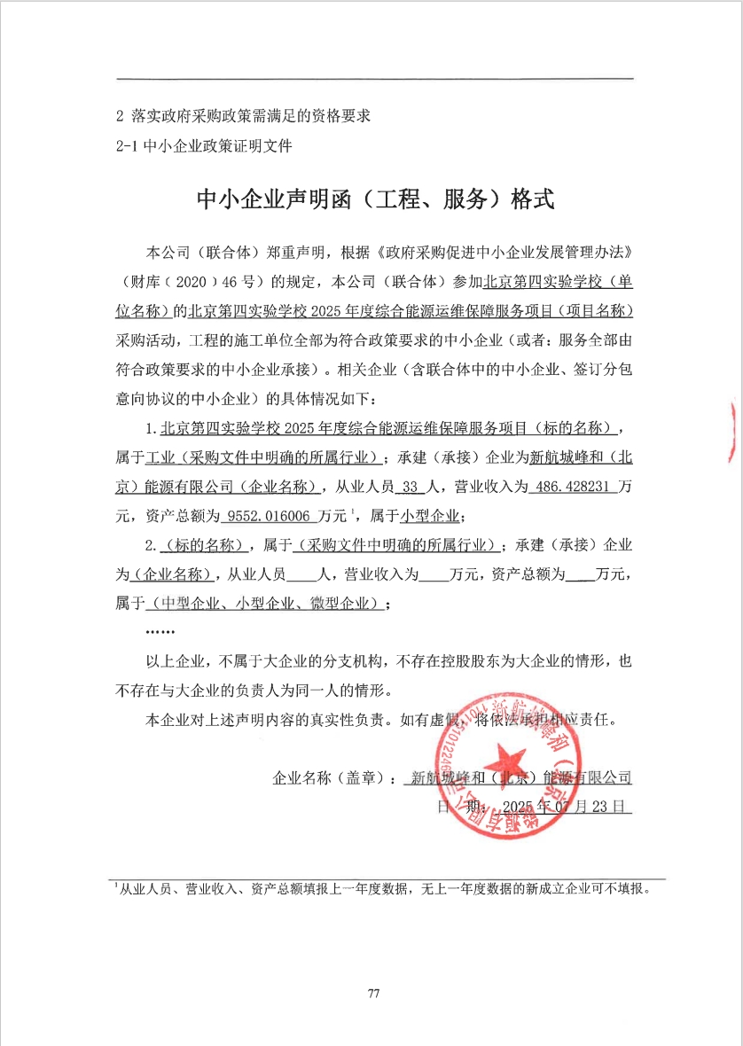 服务要求:北京第四实验学校位于北京大兴国际机场临空经济区DX09-0102-0047地块。其中市投部分总建筑面积为89483.06平方米,供能面积约85081.04平方米。根据建设时序,学校东区计划于2025年投用并有供冷和供热的需求;学校西区计划于2026年2月竣工,2025年冬季有低温供热需求。本次招标为确定2025年度综合能源运维保障单位,保障学校的用能需求。