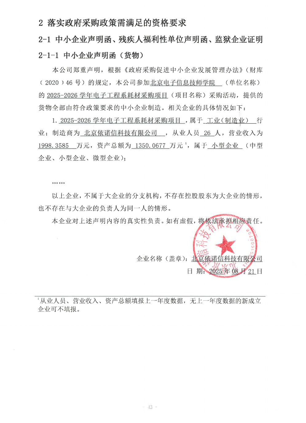 | 北京依诺信科技有限公司 | 详见附件 | 详见附件 | 1 | 33.8万元 | 33.8万元 | 2025-2026学年电子工程系耗材采购项目 |