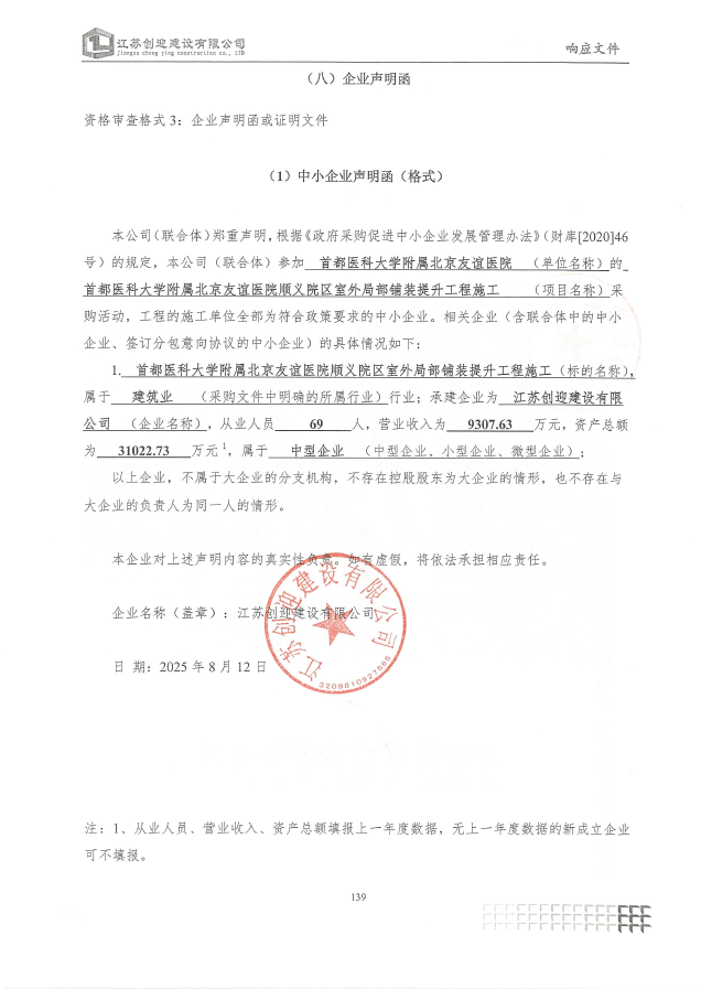 | 江苏创迎建设有限公司 | 1 | 128.931877万元 | 128.931877万元 | 首都医科大学附属北京友谊医院顺义院区室外局部铺装提升工程施工 |