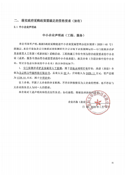 简要技术要求:对北京市各个行政区的平原及山区中500处监测站点进行定期巡查看护工作,并对其中6处泉进行人工流量监测,详见招标文件第五章采购需求。