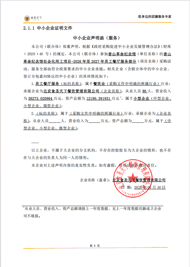 二、项目名称:香山革命纪念馆社会化用工项目-2026年至2027年员工餐厅服务部分
