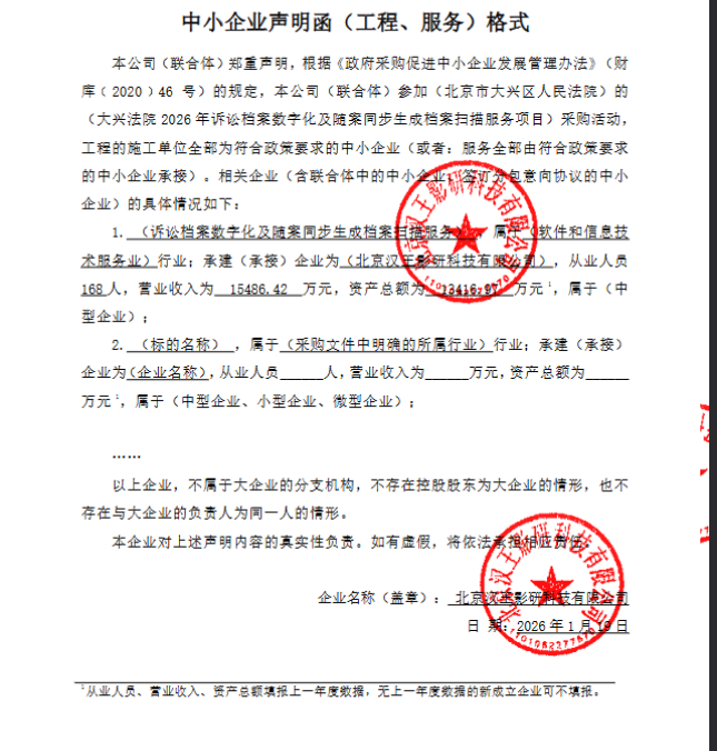 | 北京汉王影研科技有限公司 | 大兴法院2026年诉讼档案数字化及随案同步生成档案扫描服务项目 | / | 1 | 170.8万元 | 170.8万元 | 详见附件 |