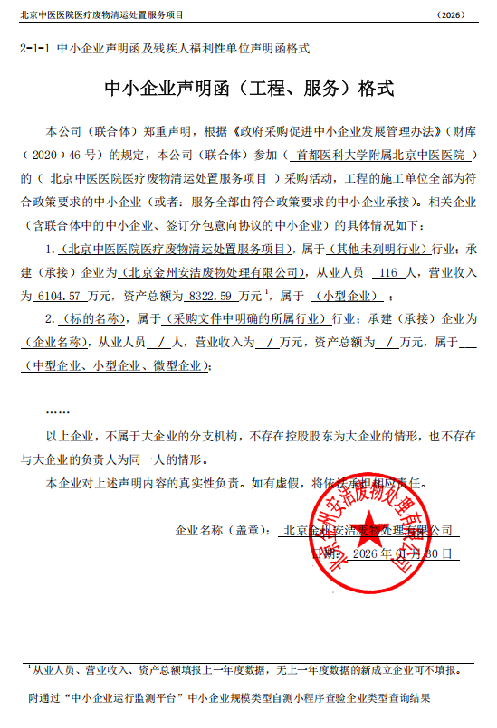 | 北京金州安洁废物处理有限公司 | 3250 | 供应商负责北京中医医院医疗废弃物的清运、处置工作。供应商应严格按照环保、卫生、消防等有关规定,按照《医疗废物管理条例》《医疗废物集中处置技术规范(试行)》等国家、北京市的相关规定及规范标准,向采购人提供及时、安全、环保的收运和处置服务,使之达到国家医院污物无害化标准要求。 |