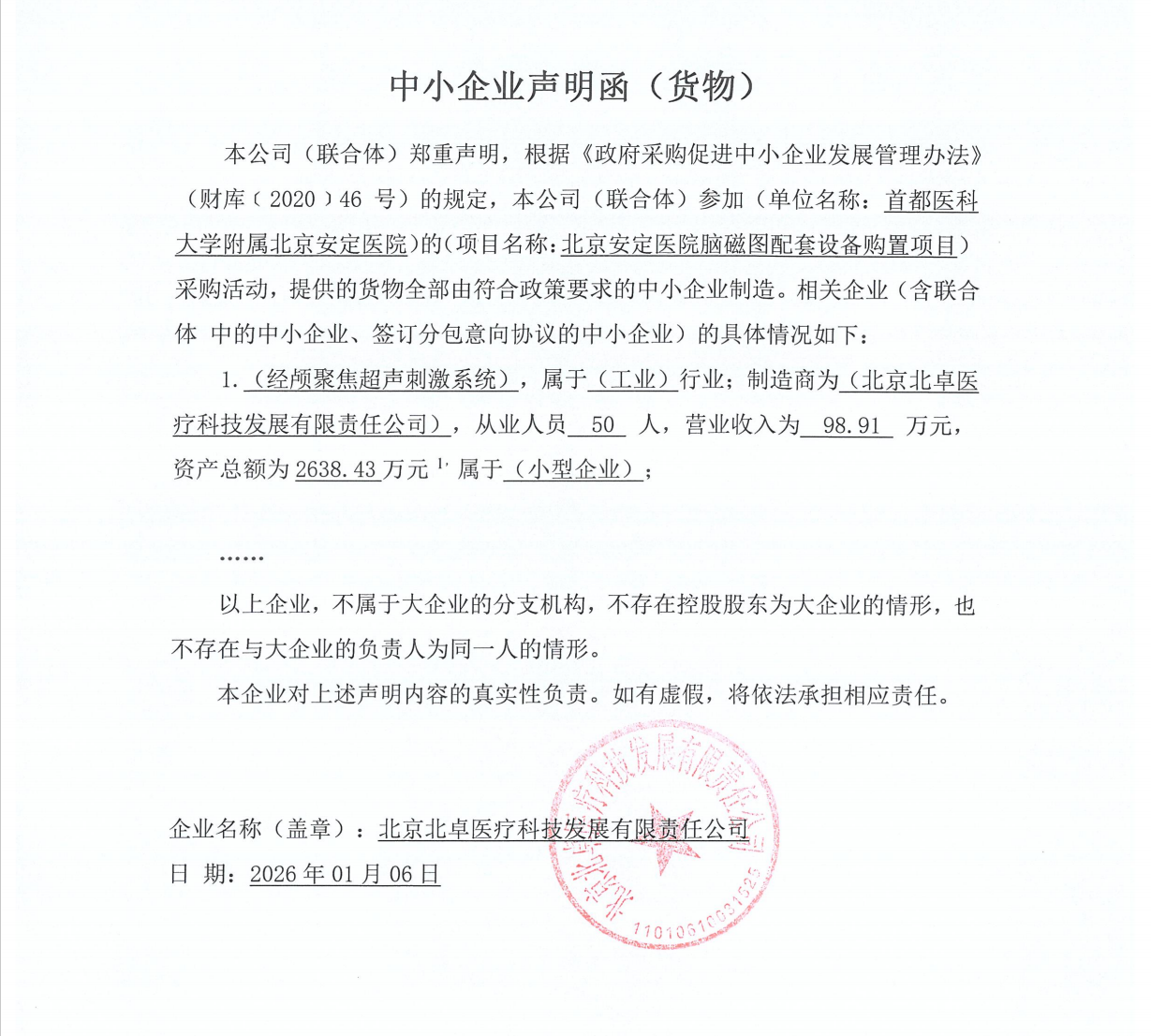 | 北京北卓医疗科技发展有限责任公司 | 北京市大兴区中关村科技园区大兴生物医药产业基地天河西路21号院17号楼1至2层 | 91110106MA04DGJ22E | 338.98 万元 | 评审总得分(综合评分法): 96 分 |