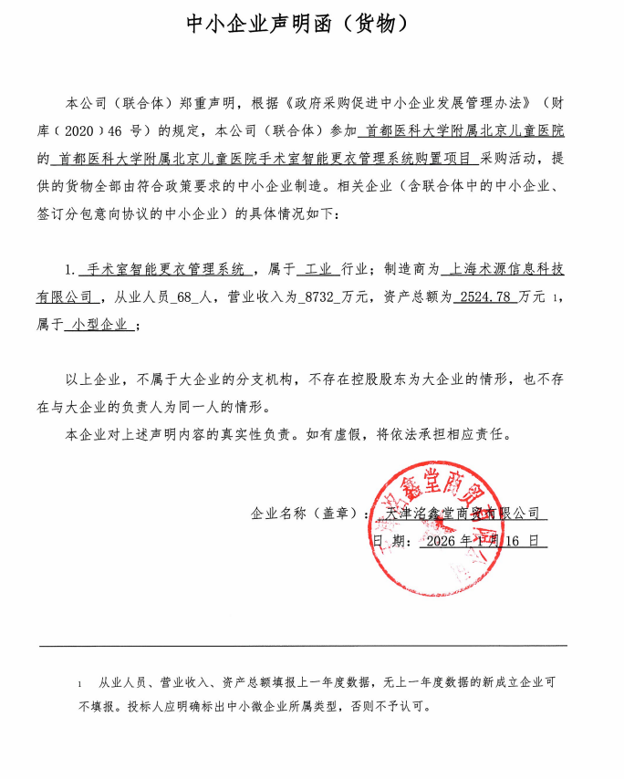 | 天津洺鑫堂商贸有限公司 | 管理系统 - 智能更鞋柜软件 | 术源手术部人员智慧管理平台软件V1.0 | 1 | 5万元 | 5万元 | 详见招标文件 |